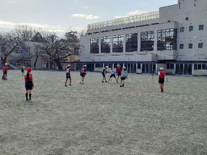 6年生の「体育」はサッカーを行っています。チームごとに練習をした後に、試合をします。試合の合間に、作戦会議を行い次の試合に生かしていました。サッカーは手を使うことができないのでとても苦労していましたが、その分たくさん走っています。