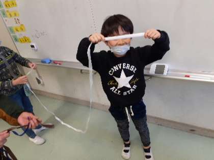 何本かのテープの長さを調べ、いちばん長いテープといちばん短いテープを調べました。