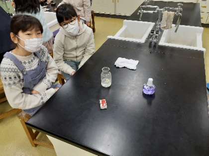 ほとんどの児童が、マッチで火をつけたことがないようで、とても緊張していました。アルコールランプにも馴染みがなく、火がつくと感動の声があがりました。理科支援員さんもいる中、安全に実験が行われていました。