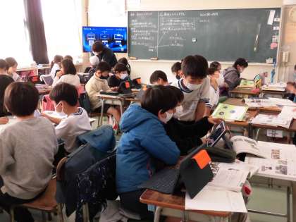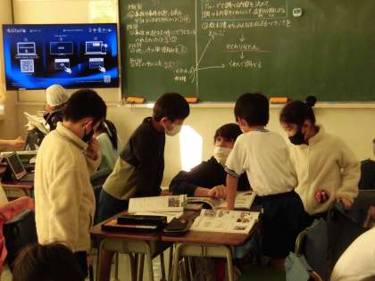 3年生は自分の暮らす地域についての学習を深めています。今は、事件や事故から住民を守るために誰がどんなことをしているのかを学習問題としています。今日は大きな4つのテーマを決め、班でどのテーマを調べたいかを決めました。続いてまず教科書の該当箇所を読み、各班員がどんな調査を担当するかを話し合いました。子どもたちは教員の説明をよく聞き、すぐに話し合いを始めました。担当決めでも、自分の意思をしっかり伝え、友達の意見も受け入れる姿から、これまで積み重ねてきた学習方法を実践していることが伝わりました。タブレットを使う調査でも担当した項目について様々なサイトを閲覧し、さらに詳しい内容をみんなに伝えられるようにメモを取っていました。下調べを深めたうえで、これから警察の方や、町の方にインタビューをするフィールドワークを実行する予定です。