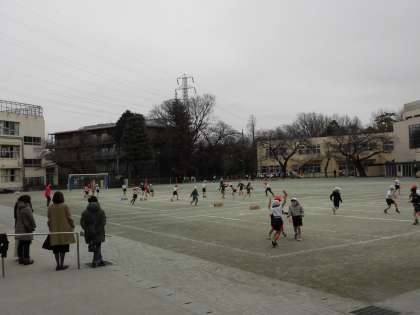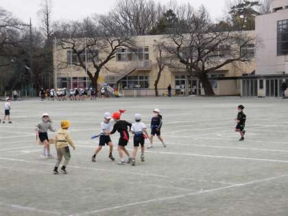 氷の混じった雨が時折降る寒い朝でしたが、3時間目にはやみ、校庭で体育を行うことができました。今日はタグをつけての鬼ごっこ遊びをしました。チームに分かれて作戦を立て、より多くの宝を自陣に運びます。「はじめ。」の合図と同時に、みんな走り出しました。うまく体をひねって敵をかわしたり、味方と協力して相手を追いつめたりゲームが盛りあがりました。おうちの方に見ていただいていることで、いっそう力も出せたようです。元気に走り回って、寒さもすっかり吹き飛んだ様子でした。