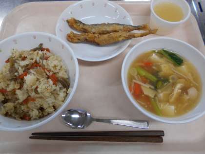 豚肉とごぼうのごはん ししゃものてんぷら 豆腐汁 リンゴゼリー 牛乳