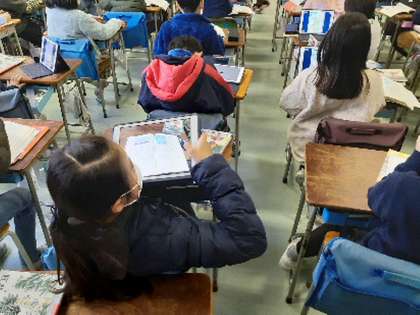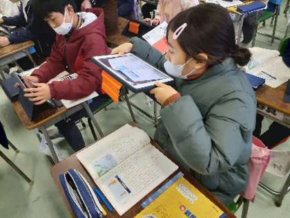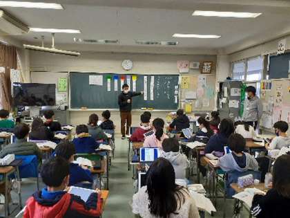 4年生の国語は「ウナギのなぞを追って」という説明文の学習をしています。今日は8、9段落の内容を確かめる活動をしました。本文を読み、調査の内容、卵を産む時期や場所などの観点別に色分けした線を引きながら内容を確かめました。タブレット端末で教科書の写真を撮り、そこに線を引きました。個人で考えた後は、その写真をロイロノートで提出し、みんなで確かめました。線を引くのも、みんなで考えを共有するのも手軽に行えるタブレット端末のよさを生かして学習を深めました。