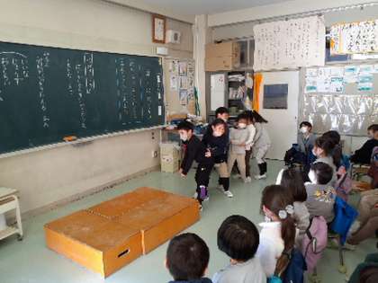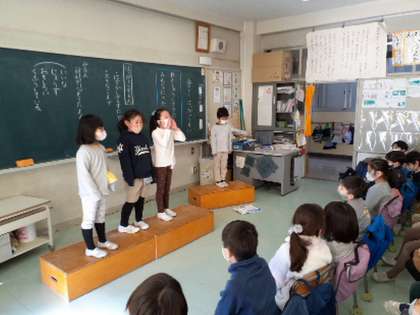 くじらぐも、たぬきの糸車、大きなかぶ、やくそく、など今年一年国語で学習してきた物語の中から自分が好きな物語を選び、同じ物語を選んだ友達とグループを作って音読劇を練習してきました。今日はその発表会でした。すらすらと読めるのはもちろん、動きやセリフの言い方などを工夫して、物語の世界をよりよく表現していました。練習の成果を存分に発揮しました。聞く側の子どもたちも、上手だったこと、おもしろかったこと、工夫しているなと思ったことなどを感想として伝えました。発表する側も聞く側もどちらも自分の思いや考えを積極的に表現していました。それぞれのよさを認め合える学級の雰囲気が子どもたちをのびのびとさせていました。