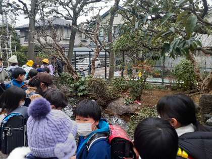 放課後、正門を入ったところにある岩石庭園の池の回りには人だかりができていました。最近の寒さで池に氷が張り、その氷に触ったり、割ったりしたい子どもたちが池を囲んでいました。