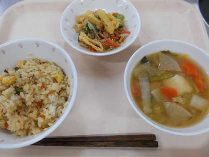 そぼろごはん カリカリ油揚げ野菜ひたし すいとん 牛乳