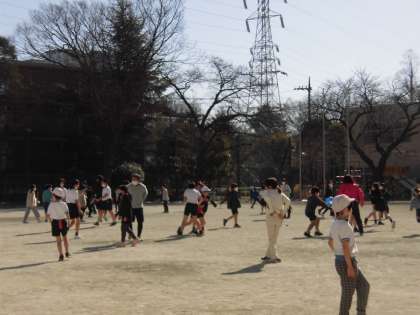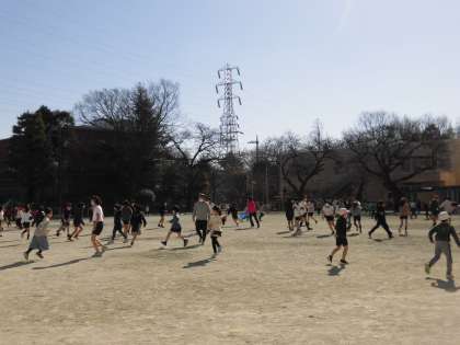 今日は雲一つなく晴れ渡った中休みでした。先週よりも暖かさが感じられたためか、子どもたちの様子はいつにも増して、元気いっぱいでした。体育館寄りの校庭では、5年4組が企画したしっぽ取りの鬼ごっこが行われました。体育で鬼遊びをしている低学年も、楽しそうに参加していました。最近は、休み時間になると職員室に教員を誘いにくる、ほほえましい光景がよく見られます。教員が加わった鬼ごっこは、いっそうの盛り上がりを見せていました。チャイムが鳴ると、少し名残惜しそうではありましたが、みんな笑顔で次に授業に向かいました。