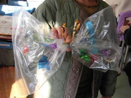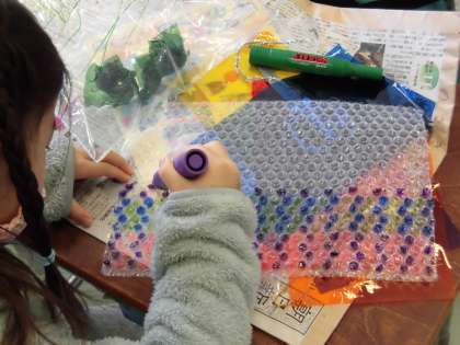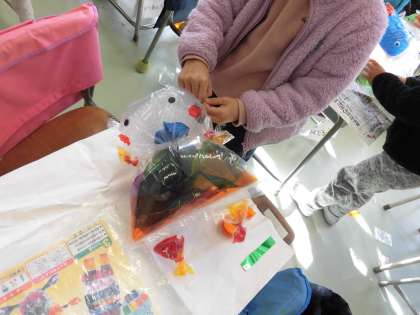 1年生は光に透ける作品づくりに取りかかっています。セロハンやビニール袋、モールなどの材料を使って、光を当てたときにどうしたらきれいに見えるのかを考えながら作ります。ビニール袋にいろとりどりのセロハンを入れて、まんなかをひもで絞っていた児童は、モールを巻いた触角をつけてちょうちょに仕上げました。プチプチとした緩衝材の一つ一つに色を塗っていた児童は「魚のうろこにするの。」と教えてくれました。ビニール袋で人形を作った児童に、大変だったところはどこかを聞いてみると、「輪ゴムで絞ったり、手足を体につけるところ。」と話してくれました。同じ材料にもかかわらず、使い方や完成した作品が一人一人違っていることが素晴らしかったです。光を受けて作品にどのような変化が起こるのか、飾るのが楽しみです。