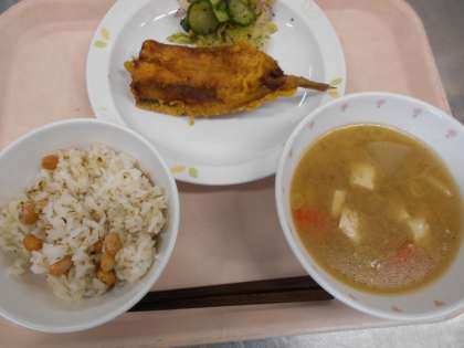 《節分こんだて》豆ごはん いわしのカレー揚げ 野菜のゆかりあえ