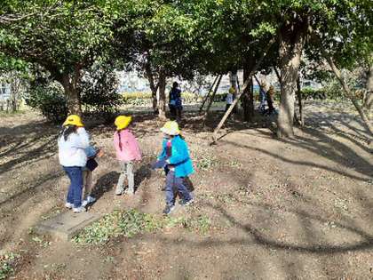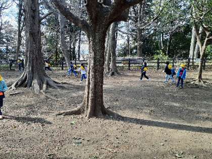 1年2組は里山で遊びました。影踏み鬼や、タブレット端末で冬の里山で見付けた物を写真に撮って、里山の自然を楽しみました。それぞれの遊び方で、友達と仲良く過ごしていました。