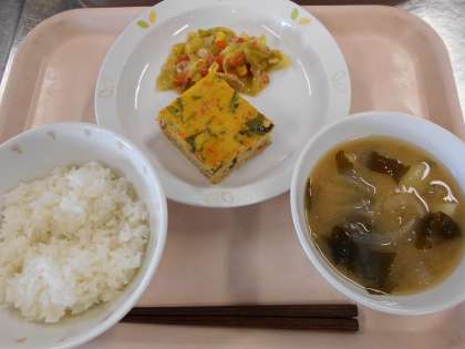 ごはん 千草焼き キャベツとコーンのソテー じゃがいもとわかめのみそ汁 牛乳