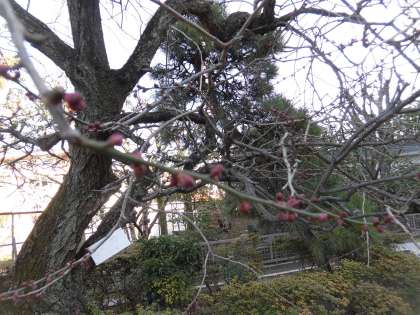 正門近くにある池は先日氷が張っていましたが、代わりに梅の木の枝に赤く色づいたつぼみがいくつもついていました。春に向かって一歩ずつ季節が進んでいます。