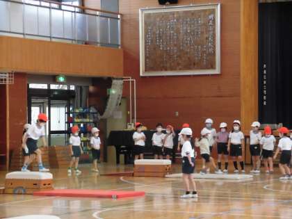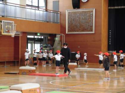 「とび箱ランドでわざをみがこう」というテーマで活動しています。しっかり準備運動を行い、注意することをみんなで確認して、けがをしないように十分注意を払います。体育館にはとび箱の数を変えて、いろいろなコースが用意されました。今日は、片足で踏み切り台に乗り、片足で降りるという一連の動きを練習しました。降りた後は両手を広げて、3秒間ポーズを決めます。踏切板を両足で乗って、降りるときも両足そろえてジャンプする児童が多く、お手本のように跳ぶのはなかなか難しいようでした。終わった人が後から来る人の動きを見てアドバイスもしました。今日はとび箱が一つのコースでしか練習できませんでしたが、これから他のコースにも挑戦し、とび箱に親しんでいきます。
