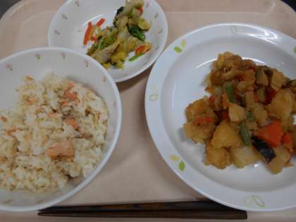 鮭ごはん 白菜のおかかあえ あげに 牛乳