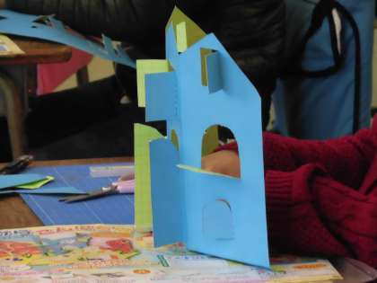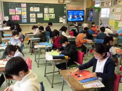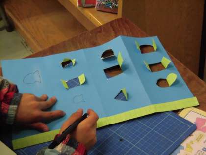 2年生は、教材を使って窓のたくさんある建物の作品づくりに取り組んでいます。好きな位置に好きな形の窓を描いて、扉が開くようにカッターで切り出します。事前にカッターの取り扱いについて、気を付けることやルールを全員で確認しました。両開き、片開き、ハート型や星形など複雑な線にも慎重にカッターを当て、上手に切り出していました。これから、内側に絵を描いた紙を入れ、窓から顔がのぞく楽しい仕掛けを加えます。高い位置に大きな窓を作った子は、「キリンを中に入れるんだ。」と話してくれました。
