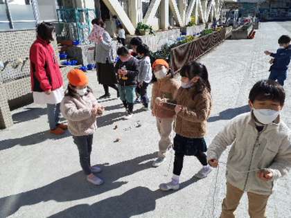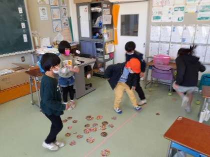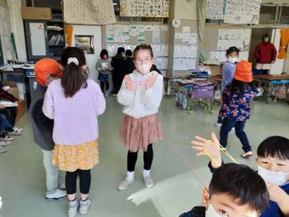 今日もはあと保育園との交流がありました。1年生が生活科で学習している昔遊びを保育園の子と一緒に取り組みました。こま回し、あやとり、メンコ、けん玉、だるま落とし、お手玉など、普段なかなか手にすることがない遊び道具に苦戦していましたが、1年生が優しく教えてあげていました。年下の子を思いやる気持ちが交流を重ねるごとに大きく育っています。