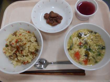 五目おこわ 煮豆 かきたま汁 ぶどうゼリー 牛乳