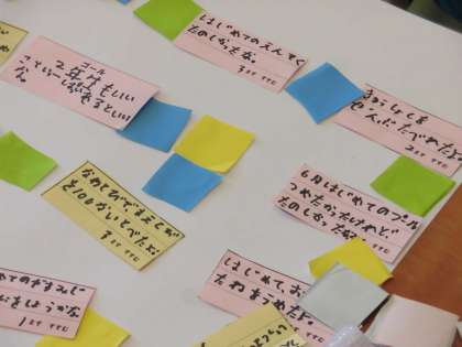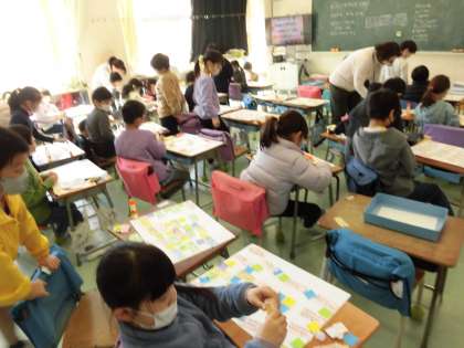 今日は台紙に並べ方を決め、貼り付けていく作業に入りました。「ドキドキ入学式」をスタートに「友達できた 4マスすすむ」「体力テストつかれたよ 2マスもどる」「朝顔育ってうれしいな 2マスすすむ」「里山でどんぐり拾い楽しかった 3マスすすむ」と、1年間のできごとを順番に並べ、コースを作りました。作品を見ると、1人1人がどんなことを頑張り、どんなことで喜び、どんなことに悔しい思いをしたのかがよく伝わってきます。ゴールには「早く2年生になりたい」「かっこいい2年生」「勉強を頑張る2年生になる」と進級に向けた意気ごみの感じられる言葉が書かれていました。完成したら、おうちの方と思い出を振り返って、楽しく遊ぶことができそうです。