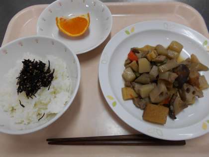 ごはん ひじきふりかけ がめ煮 デコポン 牛乳
