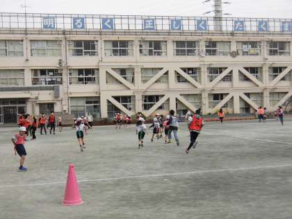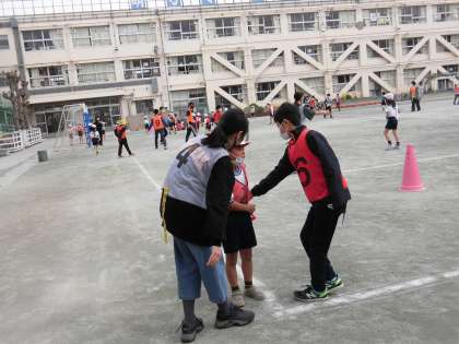 2時間目に1年4組と6年4組がきょうだい学級の交流をしました。6年生の企画でしっぽ取りの鬼ごっこをしました。ルールの説明がされ、チーム分けをするとみんなで大きく広がってゲームスタートです。体育の授業で何度もやったことのある1年生は、6年生に負けないくらいの勢いでターゲットを目指して走っていました。6年生に、はじめ手かげんをする様子が見られましたが、1年生の素早さに本気を出し始めました。それでも、端のほうに1人でいる1年生を見つけると、「どうしたの?」と気遣うやさしさはさすがでした。