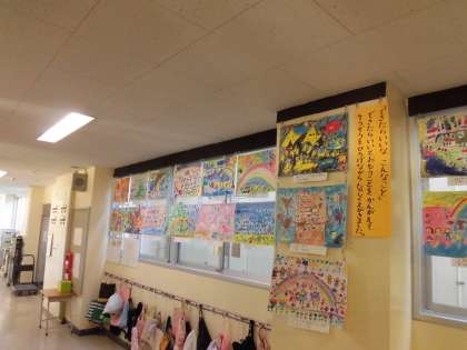 「できたらいいなこんなこと」をテーマにした絵が1年生の廊下を飾っています。ひと目見ただけで、こちらの気持ちがパッと明るくなるような作品ばかりです。大きな画用紙ですが、色づかいの豊かさや描きこみの細かさに引きこまれました。