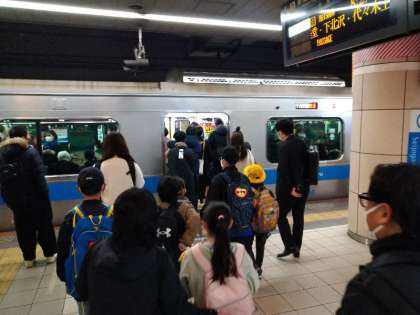 ひまわり学級のみんなは卒業遠足に出発しました。行き先は上野の国立科学博物館です。今年度、最後の校外学習です。電車が混んでいますが静かに過ごしています。