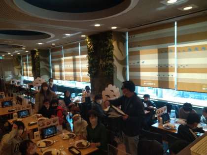 昼食の時間になりました。レストランで、カレーライスかハヤシライスを食べます。みんなお行儀よく食べられました。