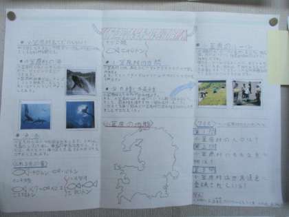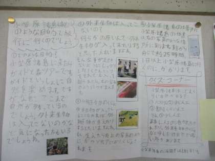 4年生が社会科で学習した小笠原村についてパンフレットにまとめました。学習を通して小笠原村の位置や自然環境、生活の様子や観光などの産業について調べました。小笠原村は、東京港から1000kmも離れています。一度も陸続きになったことが無く、固有種や他の地域ではあまり見られない動植物が生息しています。同じ東京都ですが、世田谷との大きな違いに子どもたちは驚いたようです。また、小笠原村の人々が豊かな自然を活用したり、保護したりする取組を進めていることに共感していました。