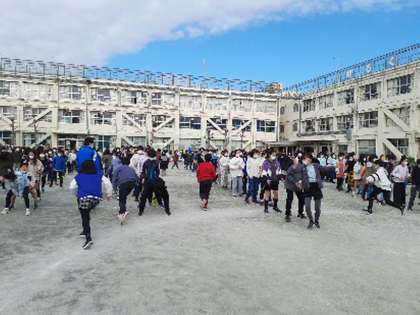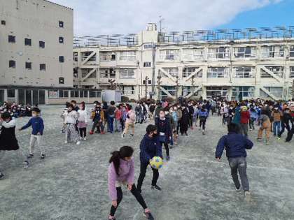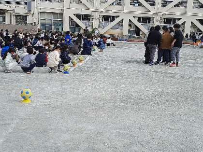 3年生対6年生は、ボール送りです。一列に並び、ボールを運びました。これは、よい勝負でした。結果の協議に時間がかかっています。