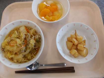 みそラーメン じゃがいものからあげ フルーツ白玉 牛乳
