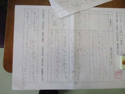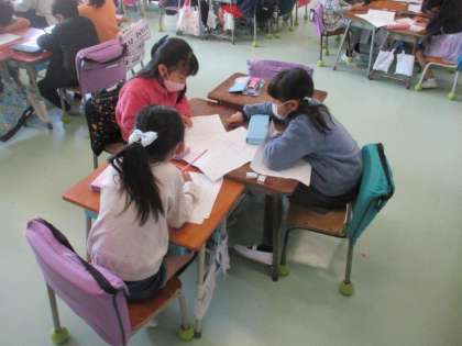 国語で「がんばったこと」や「できるようになったこと」などを作文に書く学習をしています。1年生の1年間を振り返り、友達とも相談しながら書くことを決めています。運動会の表現運動やプールに入ったこと、学習発表会のことや校外学習でみんなでお弁当を食べたことなど、いろいろ出てきました。たくさんの経験をした1年間でしたね。