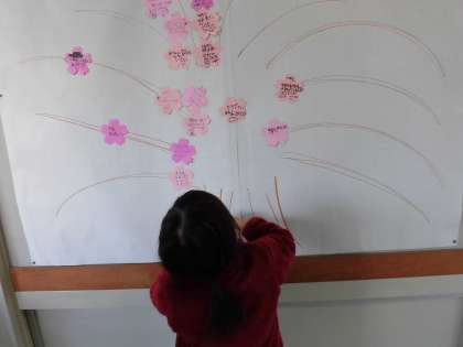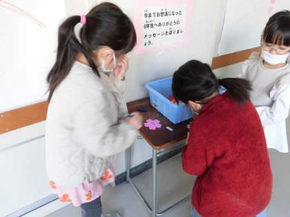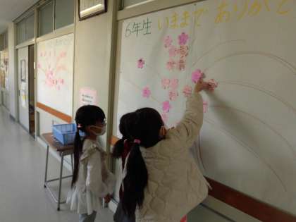 1週間ほど前から、保健室の掲示板に桜の木が登場しました。初めは枝だけの木でした。かごが置いてあり、6年生へのメッセージを書く花が用意されました。寂しかった枝に少しずつ花が咲きはじめました。その一つ一つに、お世話になった6年生への感謝の言葉がつづられています。「たてわりはん、ありがとう。」「一緒に遊んでくれてうれしかった。」「中学校でも頑張ってください。」「中学生になっても遊びに来てね。」