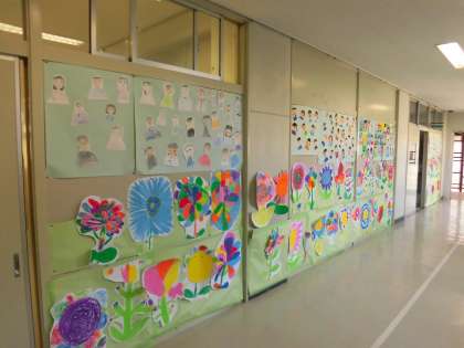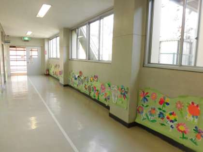 修了式を明日、卒業式を明後日に残すところとなりました。写真は体育館に続く廊下の様子です。先日紹介した保健室の桜の木に始まり、アート委員会が制作した「おめでとう。」の飾り、1年生が心をこめて描いた色とりどりの花、そこを通る人を見送る数々の笑顔。卒業式の練習に向かう6年生の心を何度も和ませたのではないでしょうか。全校で6年生の門出を祝う気持ちがあふれています。