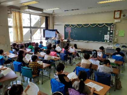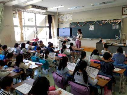 今日の1年生の学習内容の一つは明正小学校の校歌を知ることです。一人一人にプリントをわたし、校歌を流しながら口ずさむことから始めました。最後の「ここは明正小学校」の部分を元気よく歌えるようになりました。折を見てこれからも練習を続けて行きます。