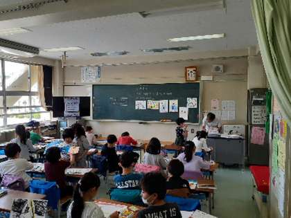 2年生は図工の時間にクレヨンの使い方、色合いの作り方を学習しました。題材は自分の好きなことです。恐竜の模型の前で写真を撮った場面、水族館でいろんな生き物を見た場面、家族でお花見に行った場面、縄跳びをしているところ、などなど、それぞれのお気に入りを絵にしました。担任はすかさず子どもの作品のよさを見付けたくさんほめていました。その姿は子どもたちにも広がり、子どもたち同士も「いいね」「色がきれいだね」「それわたしもすき」とうれしくなる言葉掛けがふえていました。