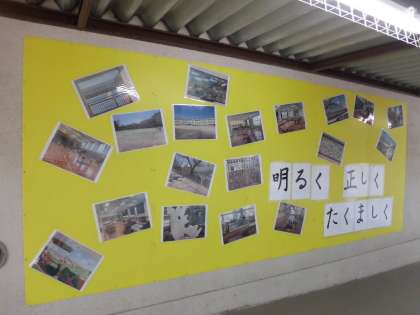 今日は体育館に続く渡り廊下の様子を紹介します。ここは以前まで何も飾りのない壁でした。昨年度の6年生がSDGsの学習をしたときに、この場所を明るくしたいと考え、知恵を絞り飾りつけをしました。学校のいろいろな場所を写した写真からは、6年間を過ごした小学校への愛着が伝わってきます。在校生、そして新入生に素敵なプレゼントを残してくれました。