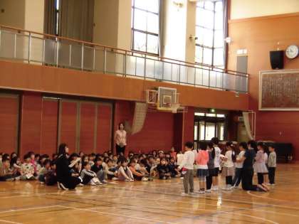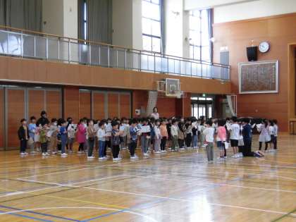 3時間目に、1年生が土曜日に行われる一年生を迎える会の練習を行いました。入学して初めての学年全体の活動です。体育館に向かう途中の保健室では、ちょうど耳鼻科の検診が行われていましたが、その前を通るときにも静かに移動する姿が立派でした。