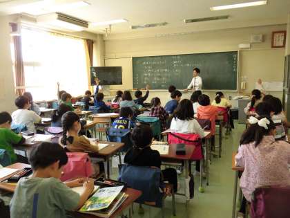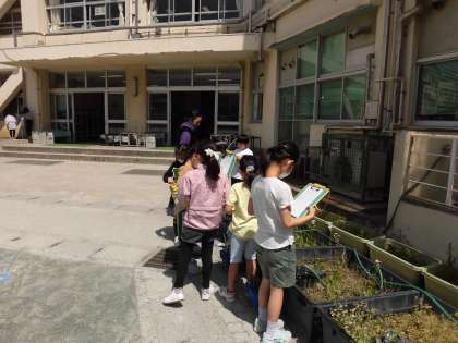 3年生では新しく理科の学習が始まります。1組では「理科ってどんな勉強?」をみんなで考えることから授業が始まりました。「研究をする」「生き物の勉強」「理科室で実験する」など次々に意見が出されました。今日のめあては「校庭にある植物を調べよう」でした。まず初めに理科の学習を進めるうえで大切な「予想」をたてました。正解かどうかにかかわらず、思いついたことをどんどんノートに書きだします。さくら、たんぽぽ、菜の花、キャベツ。ハルジオン、オオイヌノフグリなどを挙げた児童もいました。次は校庭に出かけ、たてた予想と観察した結果を比べました。「ここに去年植えたキャベツがあるよ。」「ブロッコリーもまだある。」「パンジーきれいだよ。」と見つけた植物を興奮した様子で、友達に教えていました。予想したことを自分の目で確かめる楽しさを感じているようでした。