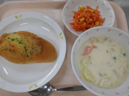 ガーリックフランス 米粉のクリームシチュー にんじんサラダ 牛乳