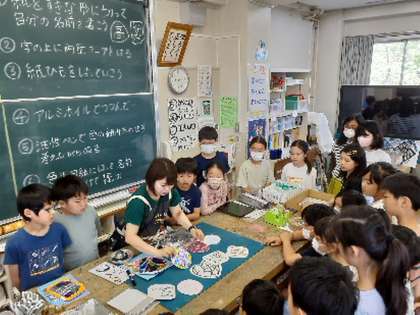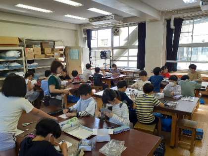 4~6年生の図工では共通の課題で学習をスタートさせています。「キラキラネーム」というネームプレート作りです。まず厚紙に名前を書きます。苗字でも名前でも、片仮名、平仮名、漢字、ローマ字どれでも自分で決めた書き方で作っていきます。書いた線の上に両面テープを貼り、紐を付けます。その上からアルミホイルを被せ押し付けて名前を浮き立たせていきます。そこからは自分で選んだ色を塗り、自分らしさを表現した見事なネームプレートが完成です。どの子も楽しそうに、意欲的に取り組んでいました。