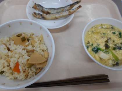 たけのこごはん ししゃものからあげ かきたま汁 牛乳