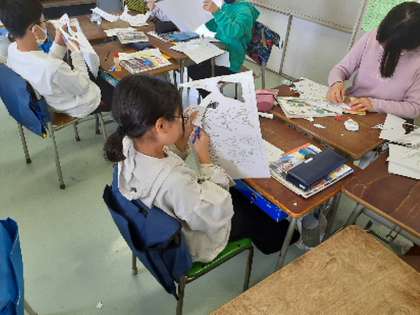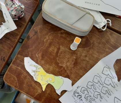 4年生の社会科は東京都に目を向けた学習が中心になります。今日は東京都の地形をつかむために立体地図を作りました。写真のようなワークシートをハサミで切り、重ねて貼っていくことで平面ではなく凸凹のある地図になります。東京都の土地の様子について全体的な特徴をつかむことができそうです。子どもたちは黙々と集中して作業に取り組んでいました。