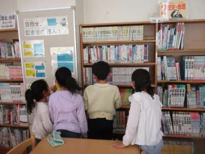 2年生までは主に絵本室を主に使っていましたが、3年生以上は図書室を活用します。3年生は図書室の使い始めです。まず司書の方から本の場所や図書室の約束などを教えていただいてから、自分の読みたい本を探して、読み始めました。走ったり大きな声を出したりする子が一人もおらず、夢中で本を探す姿が印象的でした。図書室の本は、みんなが使う本です。これからも大切に扱ってほしいと思います。
