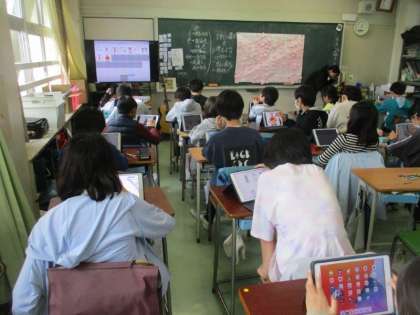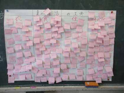 6年生が家庭科で住み良い暮らしについて学習していました。夏に向かって、生活の工夫について考えを出し合っていました。「衣」「食」「住」に分け、いろいろな考えが出ていました。これからは気温が上がる日が増えてきます。熱中症にならないよう水分補給やマスクの着脱に気を付けましょう。