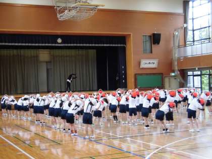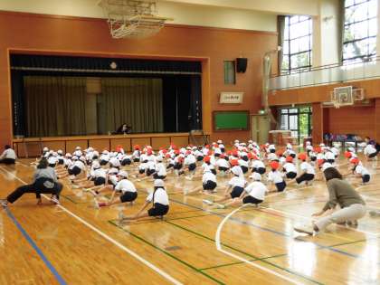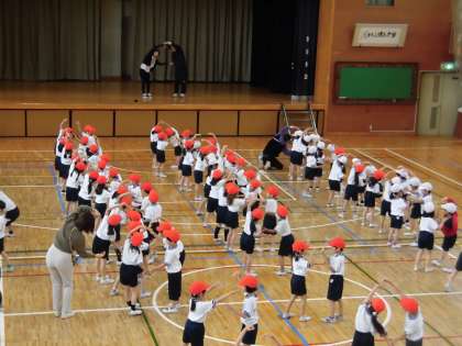 本日からいよいよ1年生も、運動会のダンス練習が始まりました。けがをしないようにしっかり準備運動をしてから始めました。はじめに教員がゆっくりお手本を見せました。動きを途中まで覚えてから、曲をかけて合わせてみました。ほんの数回の練習にもかかわらず、とても上手に踊ることができて驚きました。友達の踊りを見て、感想を発表し合うと、「動きが大きくてよかった。」「ハートがきれいにつくれていた。」といいところをたくさん見つけることができました。