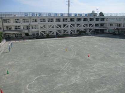 創立70周年記念の航空写真を撮影します。業者の方が校庭にラインを引いてくれました。70周年キャラクターの「ふじっち」です。全校の子どもたちが色画用紙を持って並びます。天候にも恵まれました。どんな写真が撮れるのか楽しみです。