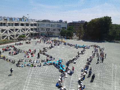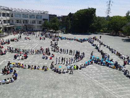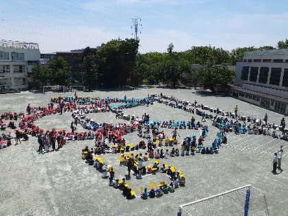 今日は創立70周年記念の航空写真を撮影しました。全校児童、全教職員でつくる模様は70周年記念マスコットの「ふじっち」です。ヘリコプターからの撮影に興奮気味の子どもたちでしたが、色画用紙を平らにして頭上に持ち、動かないように立たなければいけません。暑い中の撮影でしたが、みんな頑張りました。どんな写真になるのかまだ想像もつきませんが、完成した写真を楽しみに待ちたいと思います。