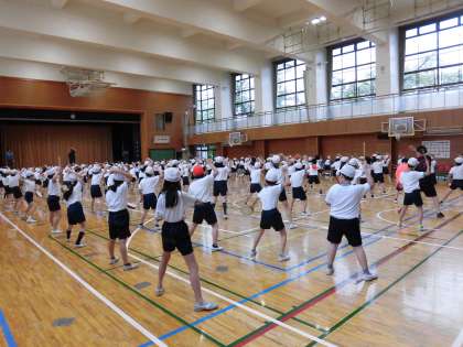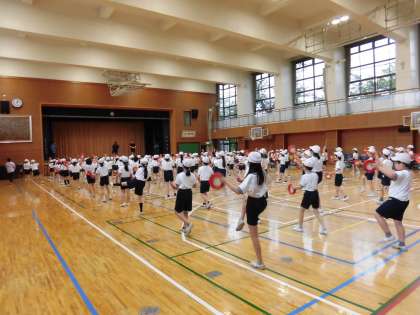 5,6校時、4年生の運動会の練習がありました。実行委員から前回までの動きの注意事こうが確認され、声出しをして気合いを入れました。注意事こうを意識しながら前回までのおさらいをしました。タメをしっかり作って、大きなキビキビとした動きができていました。150名をこえる人数なので、あわせるのもなかなか大変です。でも、かけ声と動きとパーランクの音がそろった時はとてもそう大ですばらしいです。