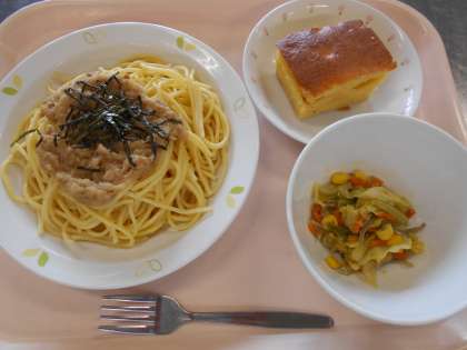 おろしスパゲッティ キャベツとコーンのカレーソテー りんごのケーキ 牛乳