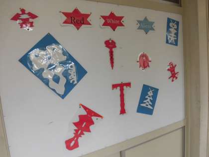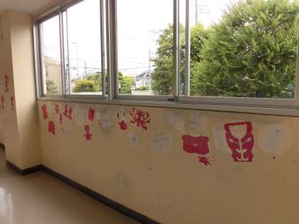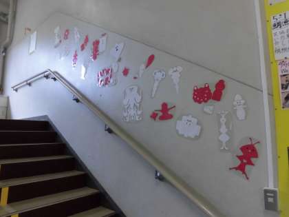 ゴールデンウイークのあけたころから校舎に赤白星人が登場し、どんどんその数を増やしています。明正小70周年の記念運動会を盛り上げるためにやってきました。正面玄関からタッチザワールドの掲示板、階段、図工室などにその姿を現しました。二つ折りにした紙に切り込みを入れて開くと、あっという間に完成します。作り方は簡単ですが、不思議なことに同じ星人はいません。子どもたちは、図工の課題の合間に何体も何体も作っていました。飾られた星人を見て、「これ私のだ。」「ぼくのは玄関にいるよ。」と友達どうし教え合うのも楽しそうでした。運動会当日まで、いろいろな場所にまだまだ出現する予定です。